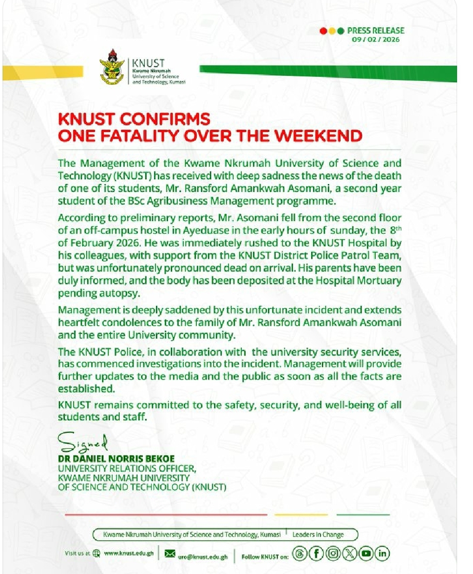 With profound sorrow, the Kwame Nkrumah University of Science and Technology (KNUST) announces the tragic passing of a second-year student following an off-campus incident. The deceased, Mr. Ransford Amankwa Asomani, was a Level 200 BSc Agribusiness student.