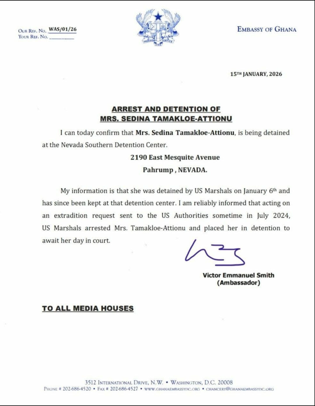 The Embassy of Ghana signed by Mr Victor Emmanuel Smith on 15th January, 2026 sent a communique to Ghanaians on the Arrest and Detention of Mrs Sedina Tamakloe Attitude.