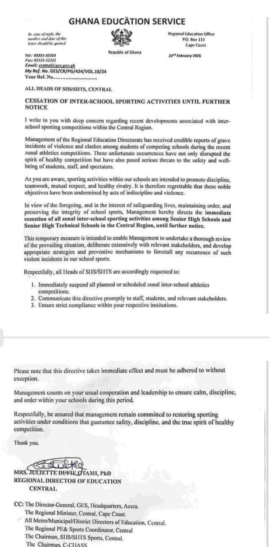 Following the death of a student at an inter-school sporting event, the Central Regional Directorate of the Ghana Education Service has announced the immediate suspension of all zonal inter-school sports activities involving Senior High Schools (SHS) and Senior High Technical Schools (SHTS).