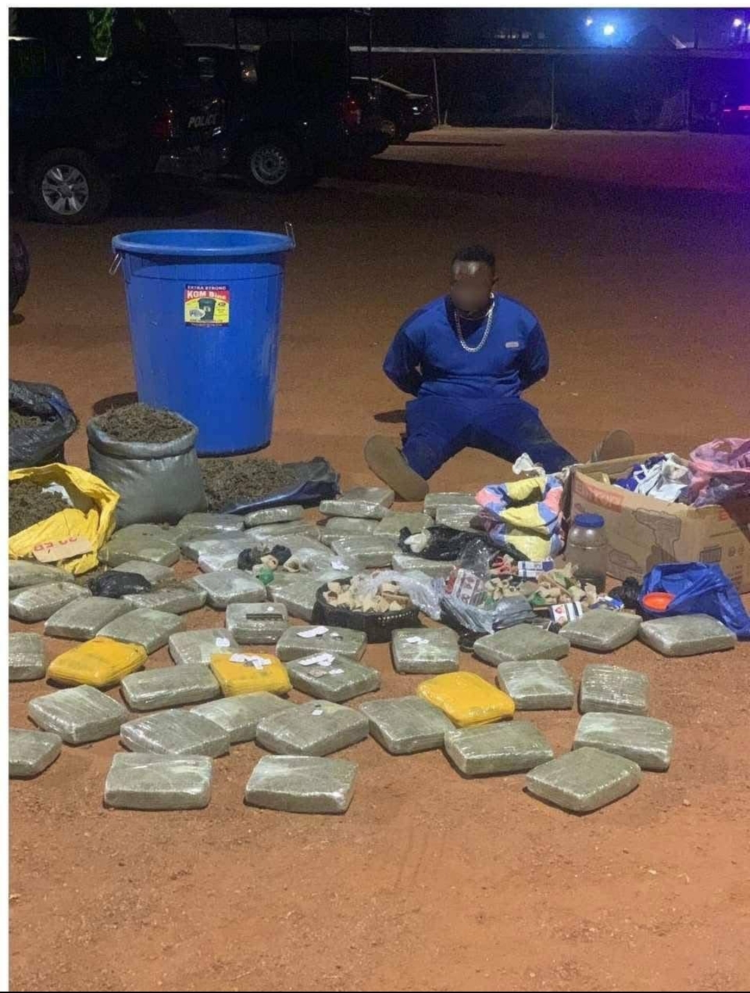 Law enforcement officers reportedly discovered a large quantity of suspected Indian hemp at his residence, including 57 compressed slabs, 195 wraps, and three sacks of dried leaves believed to contain the substance.
