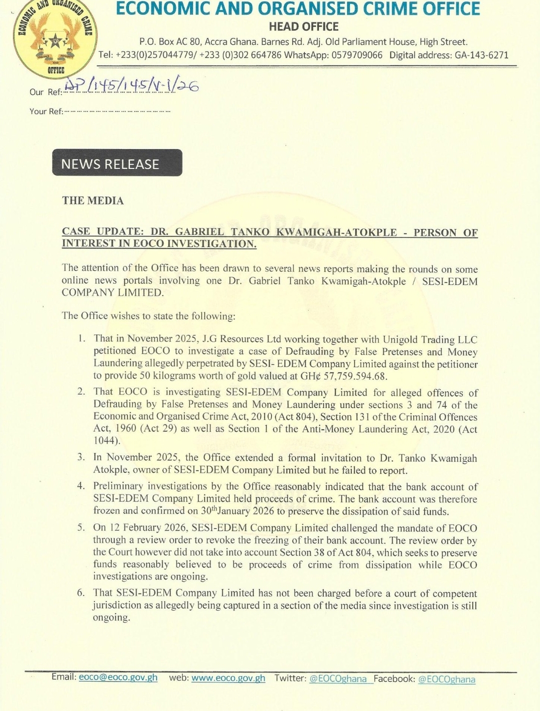 EOCO has named Dr. Gabriel Tanko Kwamigah-Atokple, owner of SESI-EDEM Co. Ltd, as a person of interest in a fraud and money laundering investigation