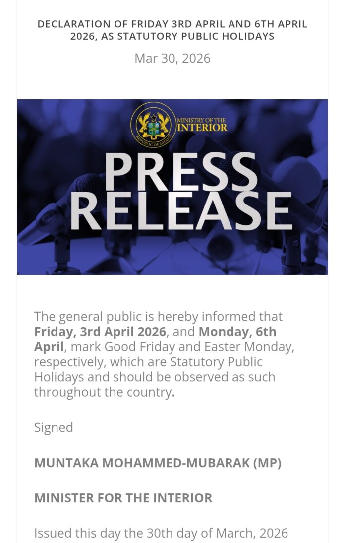 The government has issued on the Republic Holiday signed by Honourable Muntaka, on Friday 3rd April and 6th April respectively is a Republic holiday to celebrate Easter Festive.
