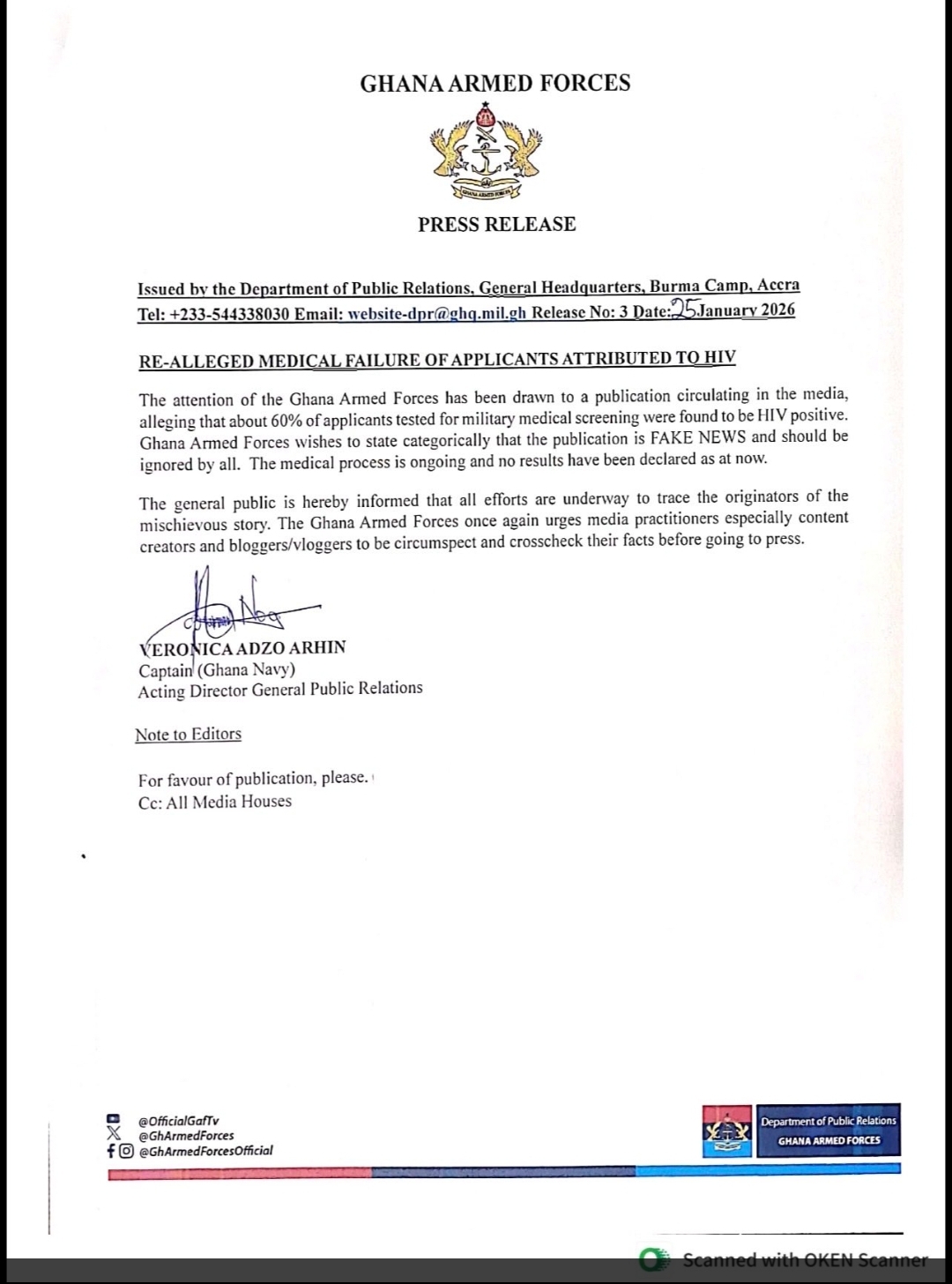 The Ghana Armed Forces (GAF) has firmly dismissed circulating reports alleging that 60 percent of military applicants failed recent medical screenings due to HIV.