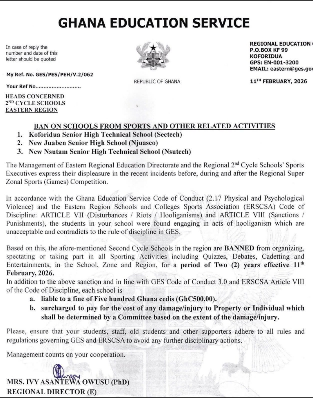 The Ghana Education Service (GES) has imposed a two-year ban on Koforidua Secondary Technical School (SecTech), New Juaben Senior High School, and New Nsutam Secondary Technical School from participating in all sporting activities.