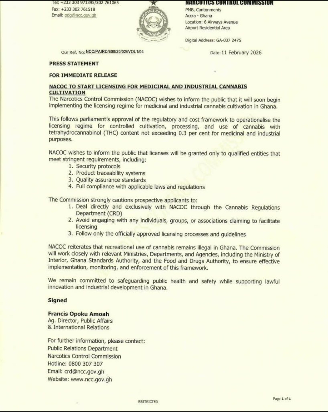 Ghana’s Narcotics Control Commission (NACOC) has announced plans to introduce a licensing system for the cultivation, processing, and use of cannabis containing no more than 0.3% THC, strictly for medicinal and industrial purposes.