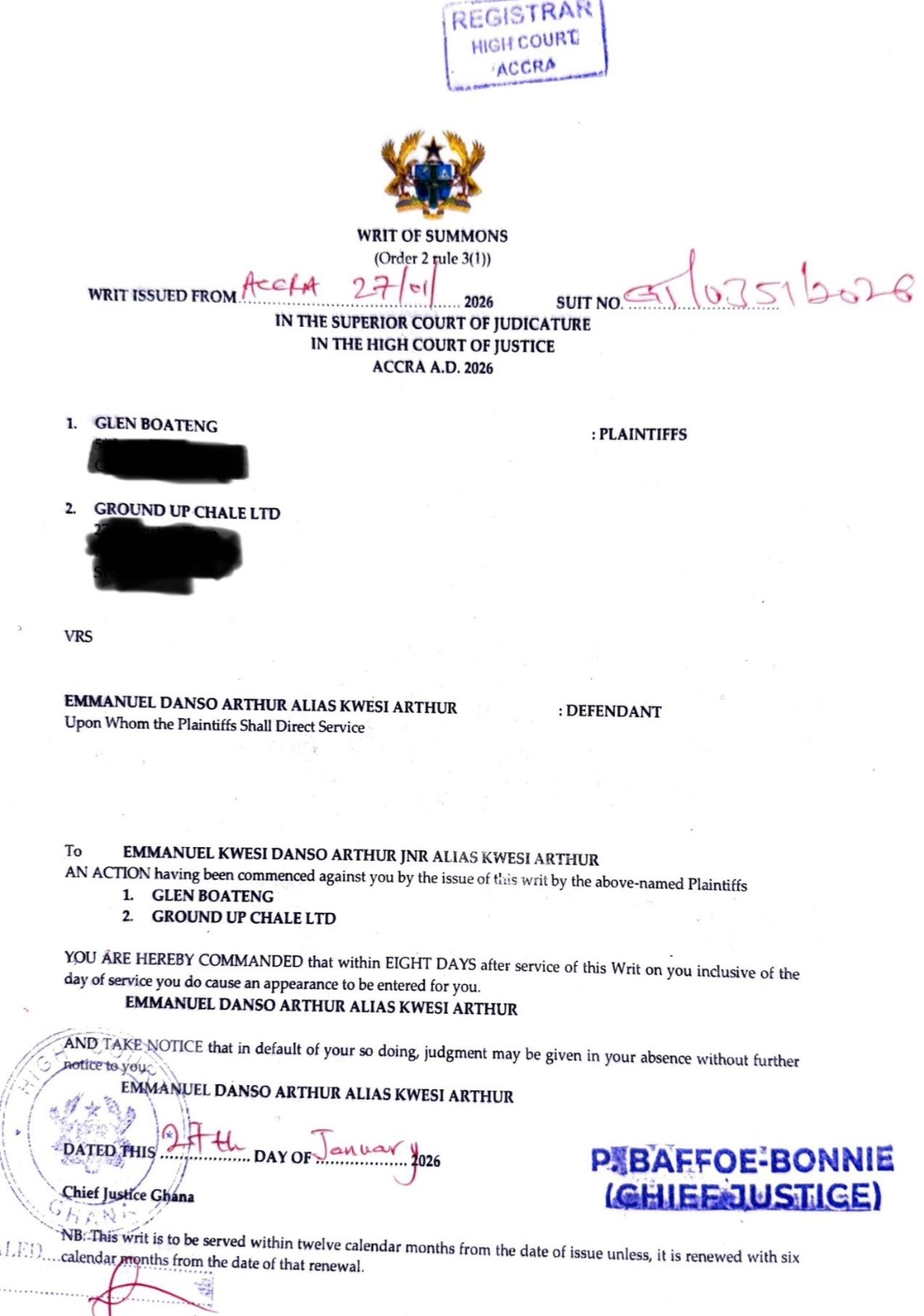 Ground Up Chale and its founder, Glen Boateng, have filed a libel suit against musician Kwesi Arthur at the High Court in Accra.